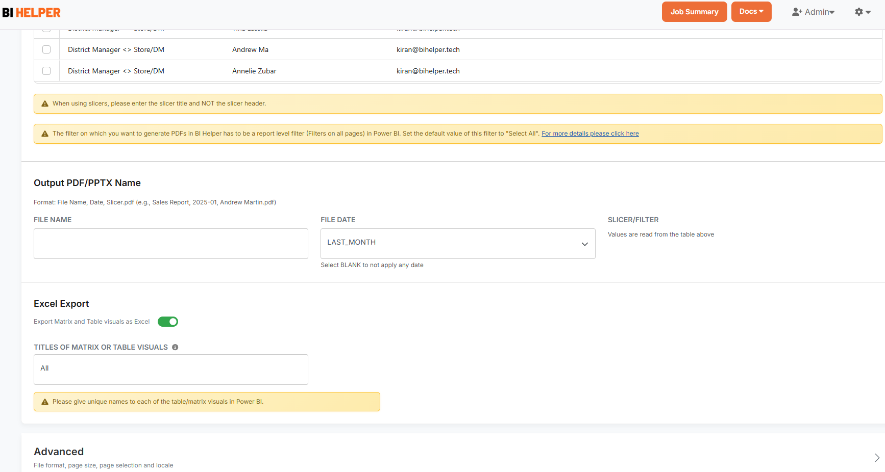 Along with PDF/ PPTX, BI Helper can export filtered/ sliced (user-specific) table and matrix visuals in Power BI to Excel. These files can be emailed to recipients on a defined schedule or on demand. This tutorial explains how to use BI Helper to automate the export of table and matrix visuals to Excel. The detailed steps are given below.
