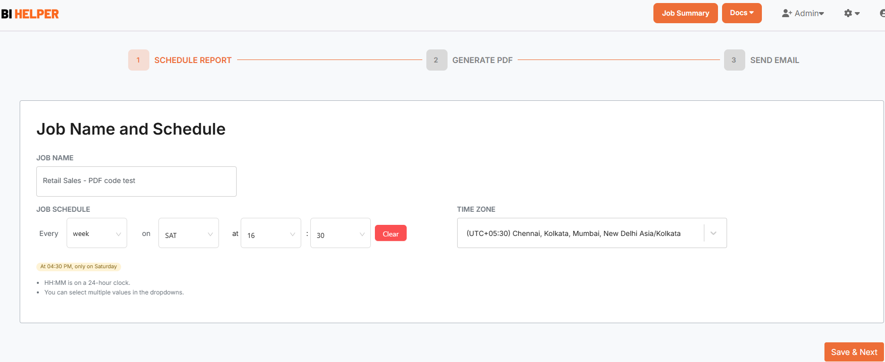3. This takes you to the Schedule Report tab. Enter the job name and job schedule. Save and go to the Generate PDF tab.