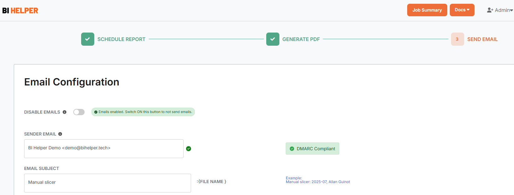 In the Job Summary tab, click on the Play button to run your newly created BI Helper job. BI Helper will apply the entered slicer, filter and email values to create and send PDF/ PPTX reports to the recipients (To, Cc and Bcc) as email attachments.
